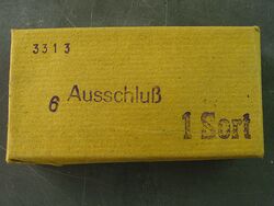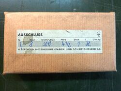 Wir liefern originalverpackte Ware. Die Abbildung auf dem Foto dient nur als Beispiel. Wir haben Ware aus verschiedenen Schriftgießereien, die Verpackung kann also auch anders aussehen. Der Inhalt ist aber genormt, ein Sortiment Ausschluß in Nonpareille (6 Punkt).
