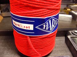 Wir liefern ausschließlich diese sehr gute rote Kolumnenschnur, die ihren Namen davon hat, daß mit ihr Kolumnen ausgebunden werden. Der Schriftsetzer schätzt an dieser Schnur, daß sie besonders weich ist und elastisch, dazu aber auch lange reißfest bleibt.